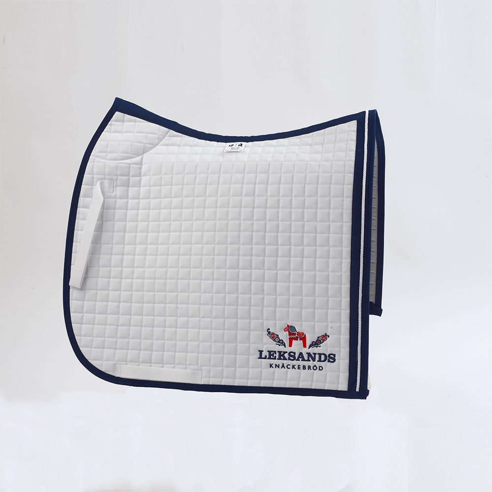 White high quality saddle pad with the Leksand Knäckebröd logo on one side.